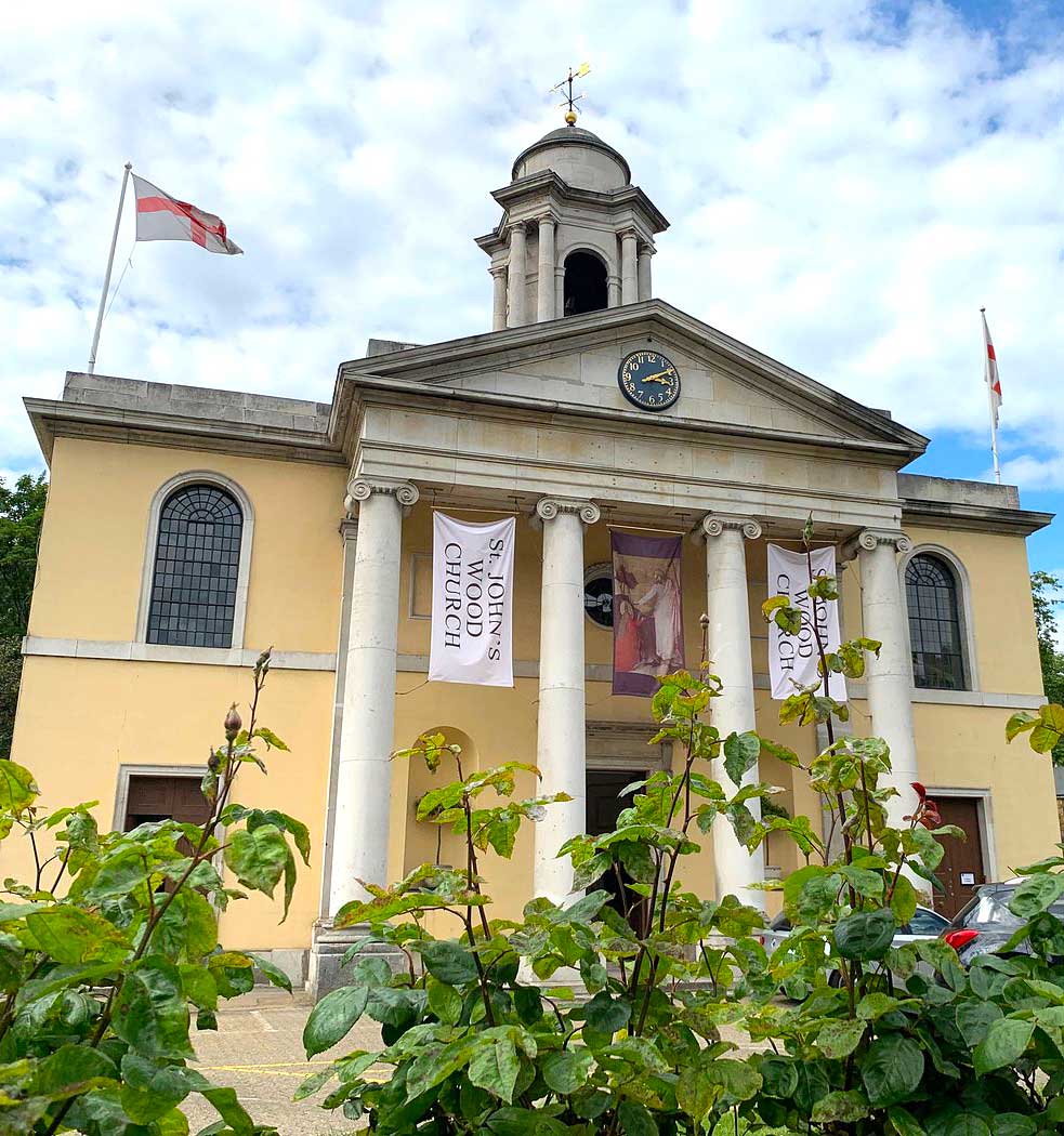 The church is a simple building in Regency style, with a portico of four unfluted columns with Ionic capitals. The interior is very plainly decorated in white and gold, and reminds some people of churches in New England. The box pews are original. The chancel was extended in the middle of the nineteenth century, when it was dominated by a stained glass window of St John the Baptist. This and other Victorian stained glass in the nave was blown out in the Second World War and was replaced with the present clear glass, which makes the interior exceptionally light, especially on a summer’s day. In 1938 the galleries of the church – which had held the overflow congregation at well-attended funerals – were closed in (they are now used as office space and for meetings). In 1991, the heavy Victorian woodwork was taken out, and the present pavement of Italian marble was installed….”